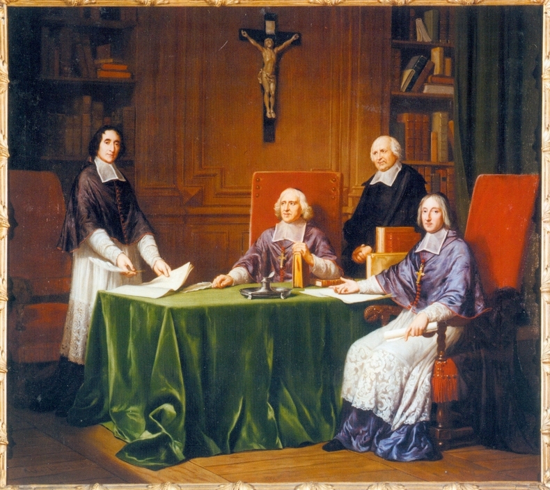 Hesse Alexandre (1856), Signature des articles de la Conférence d'Issy tenue entre Bossuet, évêque de Meaux, Antoine de Noailles, évêque de Châlons et Fénélon, archevêque de Cambrai [titre inscrit] , [Peinture à huile ], Château de Maintenon